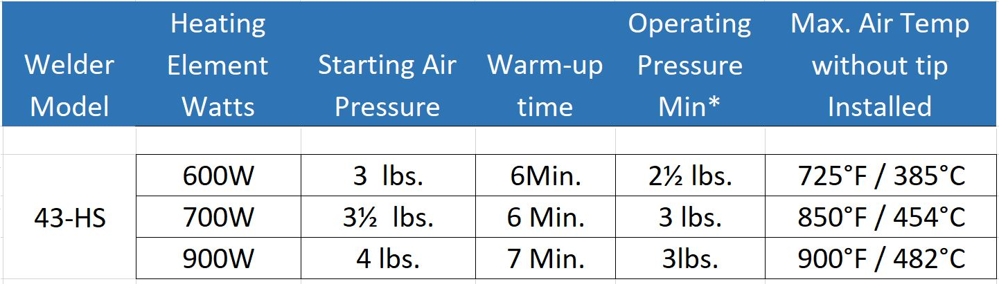 A heavy duty welder for medium and high speed welding of thermoplastics with welding speeds up to 60" (1520 mm) per minute using round or triangular tips. The standard stainless steel heating element is rated at 600 watts. This lightweight hot gas welder can be used with all types of weldable thermoplastics having a minimum thickness of 1/16". Operates on shop air or inert gas. An air regulator and pressure gauge are furnished. Complete operating and maintenance instructions can be found by clicking on Instruction Manual. Tips and accessories must be ordered separately. A complete series of replacement parts are available. Several typical markets, industries and fabricated products for the 43-HS-600 welder include: Air handling equipment (fume hoods, ductwork, exhaust fans, blowers, fume scrubbers, mist eliminators, pollution control equipment); Chemical storage tanks and liners; Plating tanks, liners and barrels; Metal finishing and anodizing; Electro deposition, etching and pickling tanks; Wet benches and processing stations; Laminar flow benches; Silicon wafer cleaning equipment; Wave soldering, photo processing and laboratory equipment; Etching stations; Orthopedic and prosthetics; Chemical processing and waste treatment equipment; Piping, valves, fittings, elbows and tees; Electrical housings; Battery boxes; junction boxes and consoles; Bait boxes for boats.