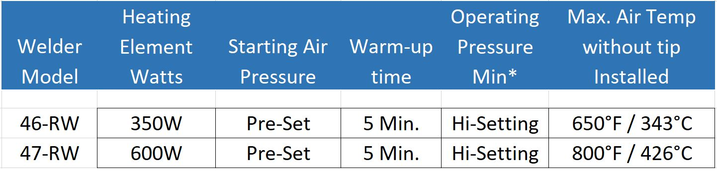 A self-contained, portable unit with built in air compressor in a metal carrying case. It comes with a stainless steel heating element rated at 350 watts. Use in the field or in the shop with thermoplastics 1/16" or greater in thickness. Model 46-RW is a light duty welder used for fabricating , maintenance or common repair. A KR round tip is included. This welder cannot be connected to an inert gas supply. Regulator and pressure gauge are furnished. Complete operating and maintenance instructions can be found by clicking on Instruction Manual. Tips and accessories must be ordered separately. A complete series of replacement parts are available. Some repair applications for the 46-RW welder include: Marine (boats, canoes, kayaks, jet skis, catamaran); RV fresh water tanks; Automobile and motor cycle ; Portable restrooms Garbage cans.